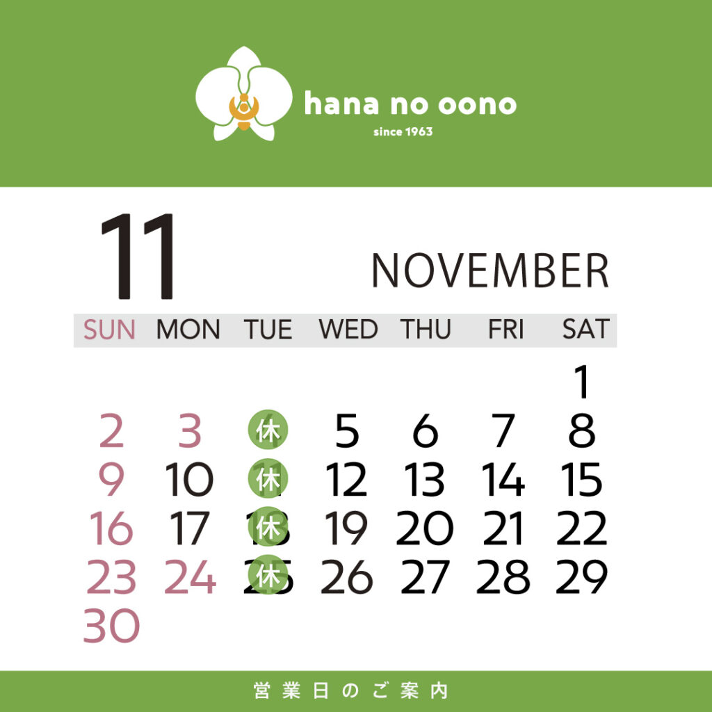愛媛県新居浜市の花屋「花の大野」の2025年11月度の営業日をお知らせします。
