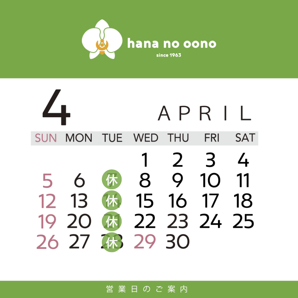 愛媛県新居浜市の花屋『hana no oono』の2026年4月度の営業日をお知らせします。